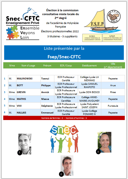 Associée au Snec-CFTC au niveau national, vous aurez donc à voter 2 fois, une pour la FSEP en CCML et une en CCMMEP pour la liste du SNEC-CFTC qui nous représente au Ministère de l’Education Nationale.