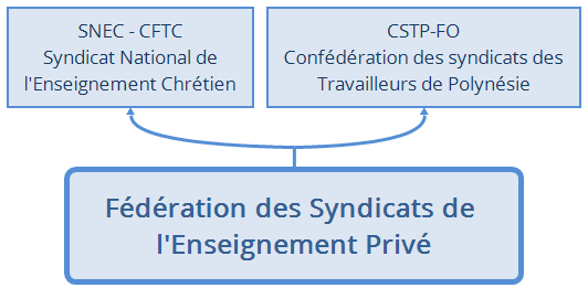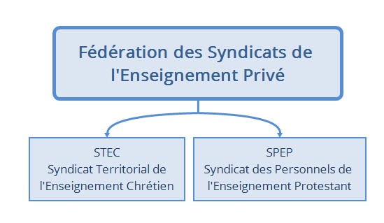 La FSEP est composée de deux syndicats qui regroupent les trois confessions religieuses. En effet, le STEC représente autant l’enseignement catholique que l’enseignement adventiste. L’enseignement protestant étant quant à lui représenté par le SPEP.